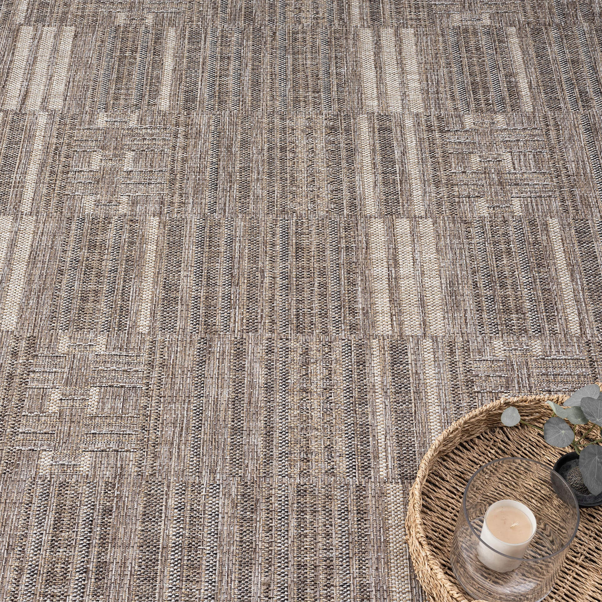 This flat-weave, indoor/outdoor collection has a subdued colour palette for versatility, and is power loomed from polypropylene with a water-resistant base. This budget-friendly range, while complementing interior spaces, is also suitable for outdoor use in covered patios, balconies, terraces, and courtyards. This highly decorative collection also has quality finishes including all-side binding, and contains shed-resistant and anti-static properties for easy maintenance.